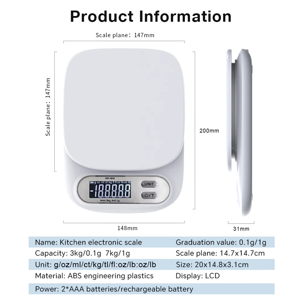 3kg/7kg LCD Digital Kitchen Scale High Precision Electronic Food Scale Suitable for Baking Coffee Tea Fitness Food Weighing Tool