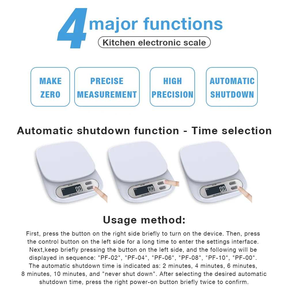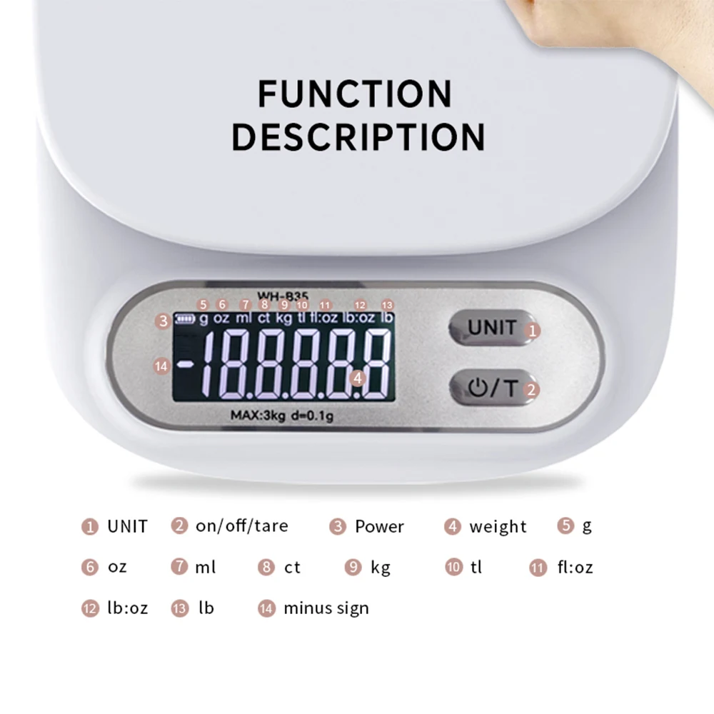WH-B33/B35 Kitchen Electronic Scale model high precision electronic scale. Scale disc and panel waterproof (other not waterproof), automatic shutdown time 6 adjustable (adjustable for never shutdown); with accurate weighing, a variety of unit conversion, rapid response, stable performance and other characteristics, especially suitable for household, baking and herbs weighing and other uses!