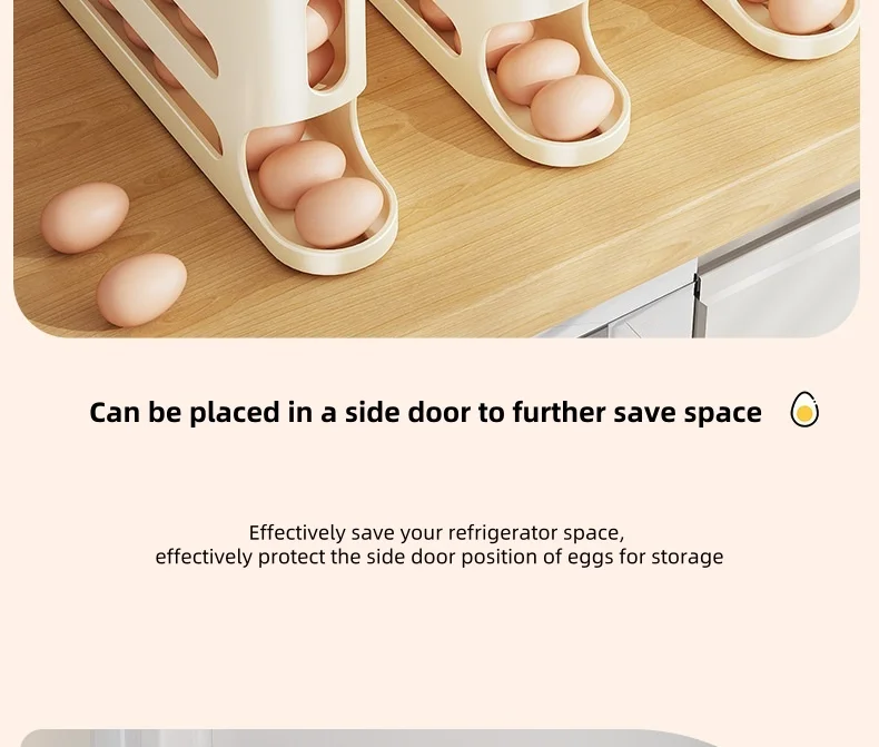 【Automatic Rolling Design】— Our egg dispenser features a gravity structure and tilt design that helps roll eggs without getting stuck. It dispenses one egg at a time in a gentle rolling motion, and the rest of the eggs roll forward automatically, so you don't worry about eggs falling or tipping over.