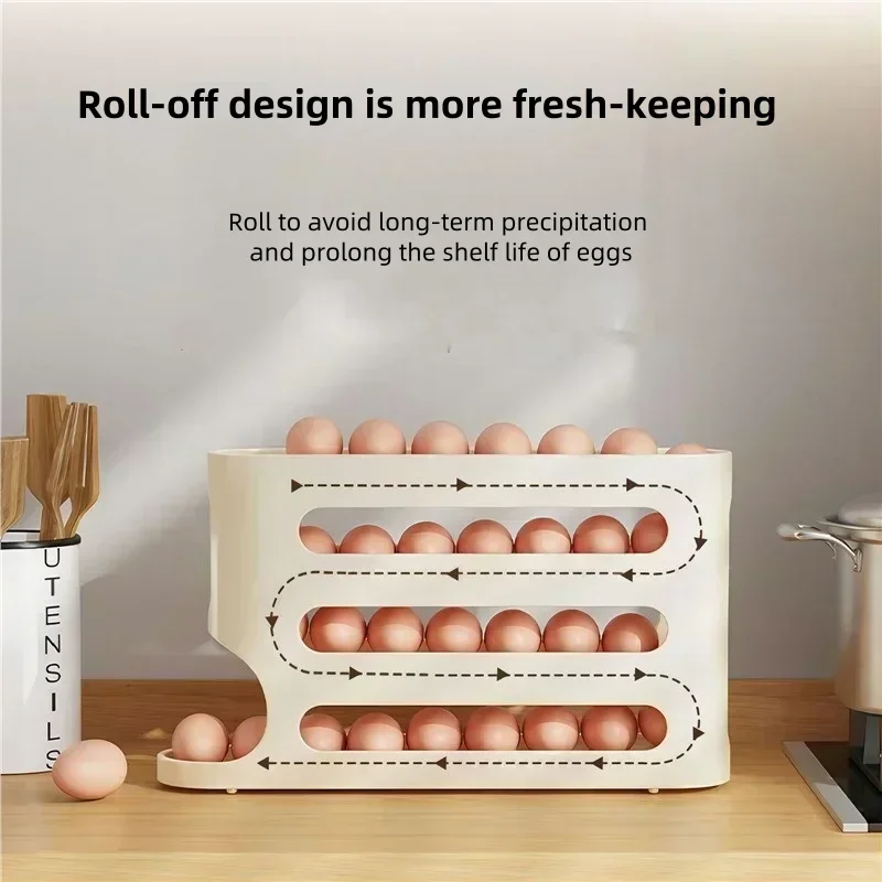 【Space Saving】— 4-tier rolling egg holder, holds approximately 30 eggs. You can easily add or remove eggs from the dispenser. The small footprint saves space on your refrigerator or kitchen counter and allows you to get out of cartons and stay neat and organized.